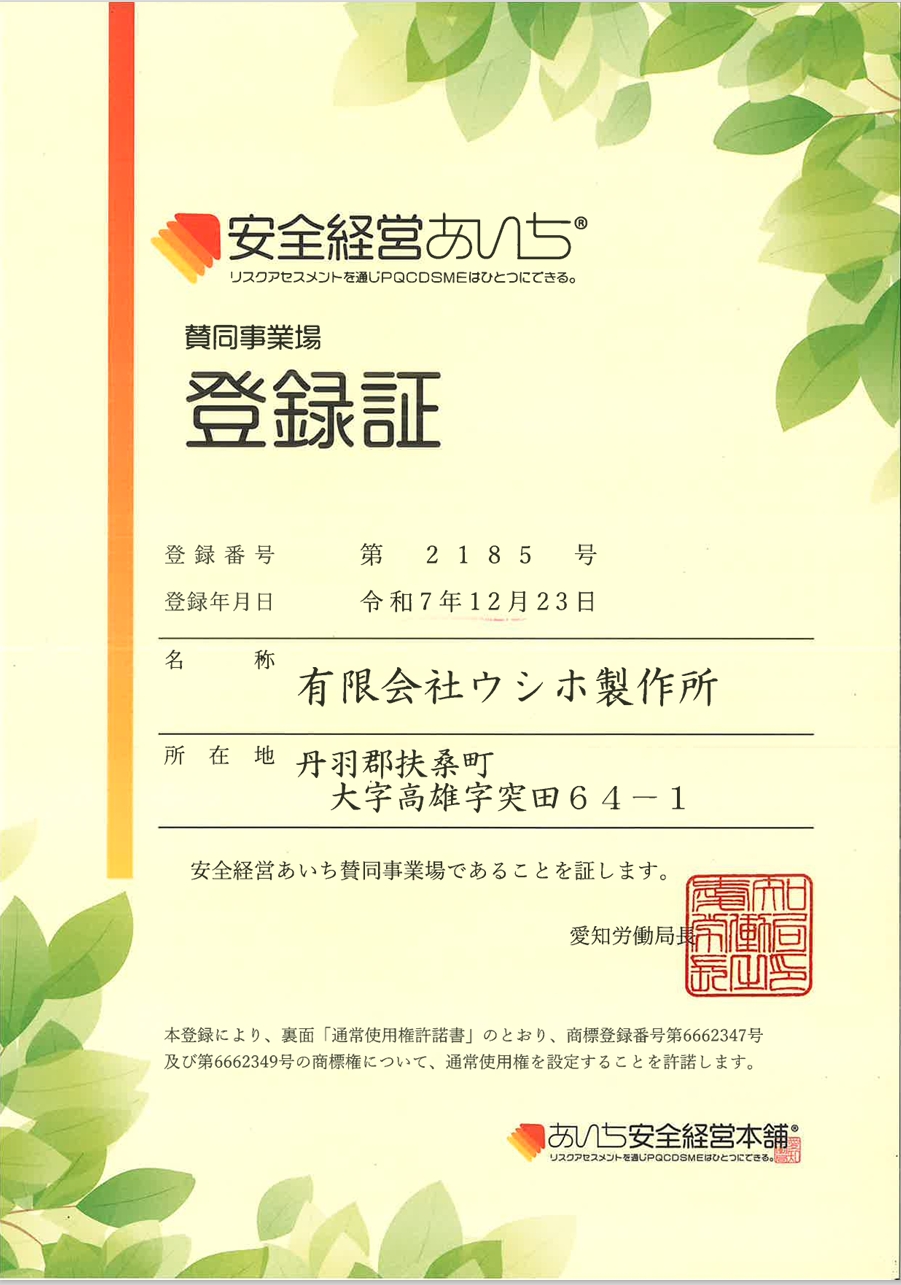 当社はこの度、2025年12月23日付で、愛知労働局が推進する「安全経営あいち」の趣旨に賛同し、「安全経営あいち賛同事業場」として登録させていただきました。